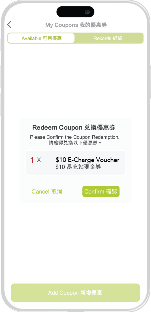 Step 3: On E-Charge HK mobile app, click ‘Confirm’ to import the selected voucher(s) to ‘My Coupons’. Apply the voucher(s) before checking out to enjoy the discount.