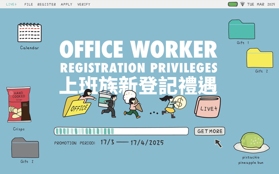 During the promotion period, existing and new LIVE+ members visit the designated promotion booth at Taikoo Place to register and verify as Office Worker may receive: