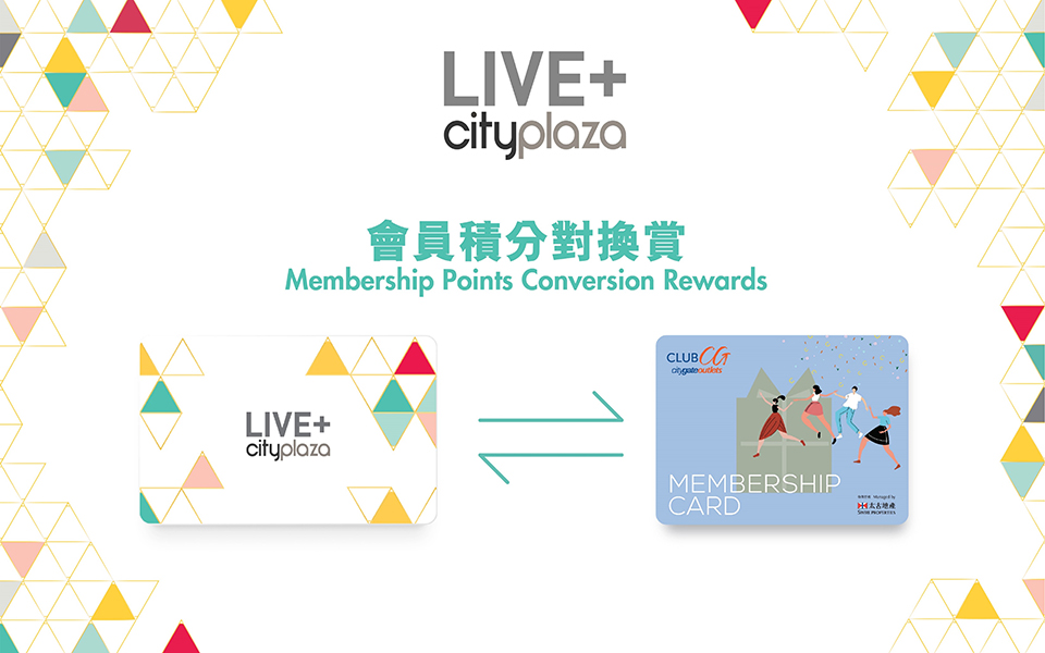 即日起至2022年10月31日,LIVE+会员只需登入TAIKOO+流动应用程式,即可以「1换1」形式,将东荟城名店仓CLUB CG积分与太古城中心LIVE+积分对换*。