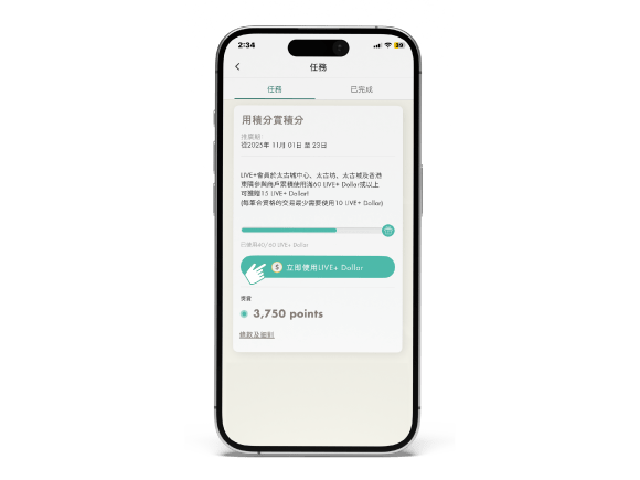 - 獎賞將於推廣期内成功使用滿指定LIVE+ Dollar金額後以積分形式存入會員帳戶,會員可在TAIKOO+流動應用程式的「積分記錄」 內查看積分詳情。